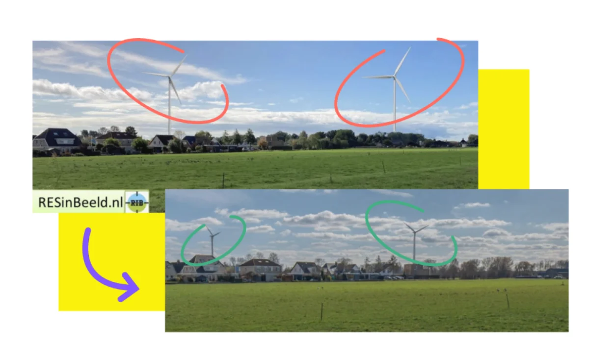 Bij gebrek aan geavanceerde software zoals die van Windplanner is RES in Beeld ‘veroordeeld’ tot het gebruik van meer handmatige methodes om windmolens in foto’s te plaatsen. Dat doen we naar eer en geweten en zeker niet met de intentie om bewust te misleiden. De werkelijkheid is voor veel bewoners al erg genoeg, daar is geen overdrijving voor nodig. Op de website leggen we uit hoe we te werk gaan. Deze methode is niet exact, afwijkingen zijn daarom mogelijk. We beschrijven dat als volgt: