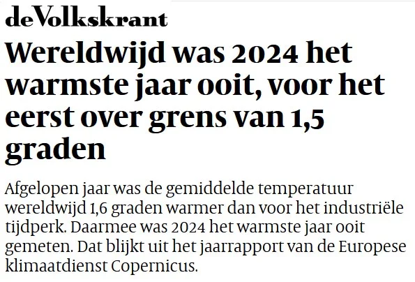 Bovenstaande tekst is afkomstig uit de Volkskrant van 10 januari 2025. Die 1,5 graad is de reserve ‘deadline’ zoals vastgesteld in het klimaatakkoord van Parijs in 2015. In de officiële tekst ziet dat er zo uit: