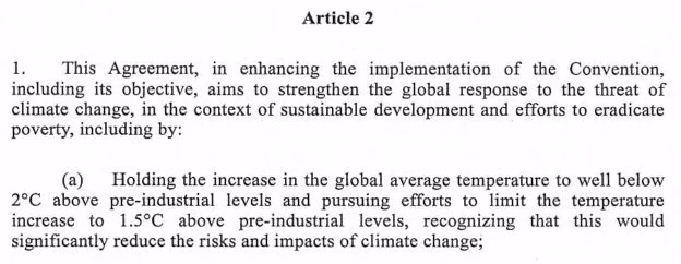 “ (a) het beperken van de stijging van de wereldwijde gemiddelde temperatuur tot ruim onder 2°C boven het pre-industriële niveau te houden en de inspanningen voort te zetten om de temperatuurstijging te beperken tot 1,5°C boven het pre-industriële niveau, in het besef dat dit de risico’s en gevolgen van klimaatverandering aanzienlijk zou verminderen”