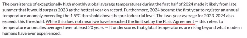 Het door mij rood onderstreepte zinsdeel stelt terecht dat de piek van 2024 niet wil zeggen dat we de 1,5 gradengrens van Parijs hebben bereikt.