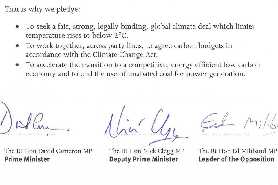 Tien jaar geleden ondertekenden de leiders van de drie belangrijkste partijen van het Verenigd Koninkrijk, David Cameron, Nick Clegg en Ed Miliband, hun plechtige belofte waarmee ze het klimaat- en energiebeleid effectief uit het democratische proces haalden: