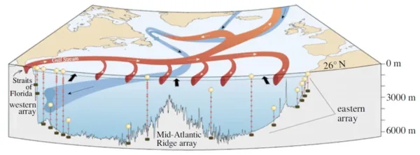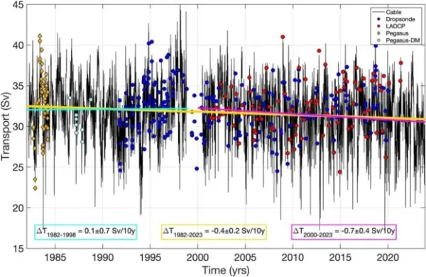 Een belangrijke AMOC-component, de Florida Current (FC), wordt bijna continu sinds 1982 gemeten met onderzeese communicatiekabels tussen Florida en de Bahama’s op 27°NB. Een afname van de FC sterkte zou kunnen wijzen op een verzwakking van de AMOC.