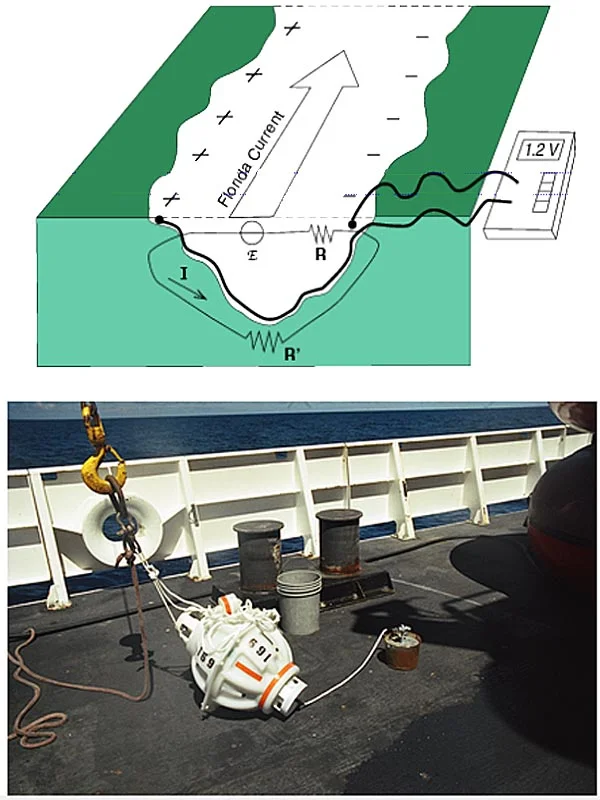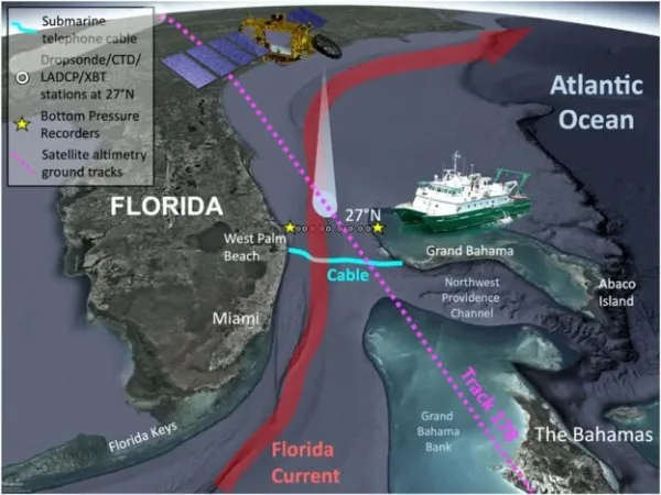 De stroming van de Florida Current wordt hoofdzakelijk op twee manieren verzameld: door het spanningsverschil over de Strait of Florida te meten met behulp van die onderzeese telefoonkabels, en via kleine dropsondes vanaf onderzoeksvaartuigen (figuur 5). Over de communicatiekabels wordt een kleine spanning gezet. De stroom door de kabel is een proxy voor de hoeveelheid water die door de Strait stroomt.