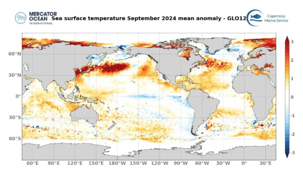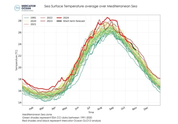 Direct na de hevige neerslag en overstromingen werd in media gewezen op de extreem hoge temperatuur van het water van de Middellandse Zee dit jaar dat een rol zou hebben gespeeld. Mercator houdt de SST (sea surface temperature) van onder andere de Middellandse Zee bij. In de grafiek van figuur 8 is inderdaad te zien dat afgelopen zomer de sst van de Middellandse Zee opvallend hoog was. Maar DANA ontstaat niet ‘s zomers maar in het najaar, in 2024 in de laatste week van oktober. De grafiek laat zien dat eind oktober de (voorlopige) sst geen recordhoogte meer laat zien en net boven het gemiddelde voor die tijd van het jaar ligt. De grafiek van 2023 ligt eind oktober ongeveer een graad hoger dan van 2024, maar van DANA in de herfst van 2023 was geen sprake. Dat is niet verbazingwekkend, want het ontstaan van DANA is afhankelijk van een veelheid van factoren, en de sst is er een van.