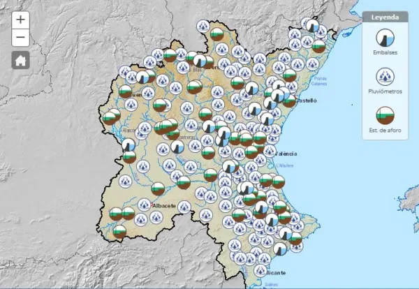 Bovenstaande figuur geeft de hydrologische infrastructuur weer in het afvoerbekken van de Jucar. Dat bestaat uit een aantal stuwmeren (embalses) in de bovenloop van de rivieren. Dergelijke stuwmeren zijn belangrijk voor de opvang en vasthouden van water ten behoeve van droogtebestrijding en vaak ook van het opwekken van hydro-elektriciteit. Voor het bufferen van extreme neerslag is hun rol beperkt gezien de hoogteligging. Alle neerslag die benedenstrooms van de stuwdammen valt heeft ‘vrij baan’. Verder zijn er veel regenmeters geplaatst een ring van afvoermeters die het debiet in de rivieren meten. De afvoer van neerslagwater in het afvoerbekken van de Jucar lijkt dus goed gemonitord.