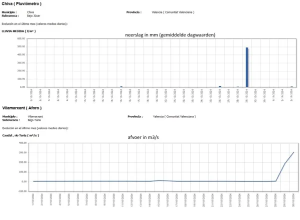 Ik zoom nu in op de omgeving van het stadje dat zo zwaar getroffen is, Paiporta (rood omlijnd). Het stroomopwaarts dichtstbijzijnde neerslagstations is Chiva. Het afvoermeetstation in de rivier Rambla del Poyo die even stroomafwaarts door Paiporta stroomt levert geen data. Wellicht beschadigd? Daarom gebruik ik de grafiek in de rivier de Turia even ten N ervan. Dit zijn de meetgegevens van de afgelopen dagen: