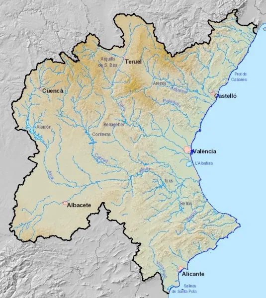 Bovenstaande kaart geeft het hydrologische afwateringsgebied van de rivier Júcar en wijde omgeving weer. De afstand van Cuenca naar Valencia is ongeveer 200 km. Het binnenland bestaat uit hoogvlakte en middelgebergte met toppen tot bijna 2 km hoogte, de kustvlakte is op veel plaatsen relatief smal. Op het kaartje (vergroten) is goed het zogenaamde dendritisch dalstelsel te zien van de rivieren, als de wortels van een boom. Dat geeft ook meteen aan waar het overstromingsgevaar het grootst is, namelijk stroomafwaarts, waar het water van veel zijrivieren zich verzamelt.