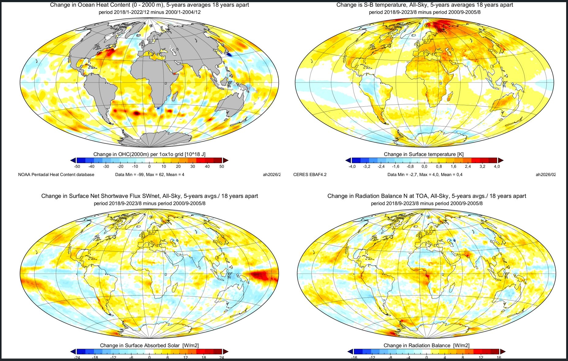 Ik voeg hierboven een aantal afbeeldingen toe van (vanaf linksboven met de klok mee) veranderingen in oceaanwarmte-inhoud (een gevolg van opwarming), veranderingen in oppervlaktetemperatuur (de uiting van opwarming), veranderingen in de stralingsbalans (die opwarming zou moeten aandrijven) en de door het oppervlak geabsorbeerde zonnestraling (die opwarming veroorzaakt). Dit zijn tijdsverschillen over 18 jaar van vijfjaarsgemiddelden uit de beste beschikbare data: NASA’s CERES-gegevens en het ARGO-programma voor oceaanonderzoek.