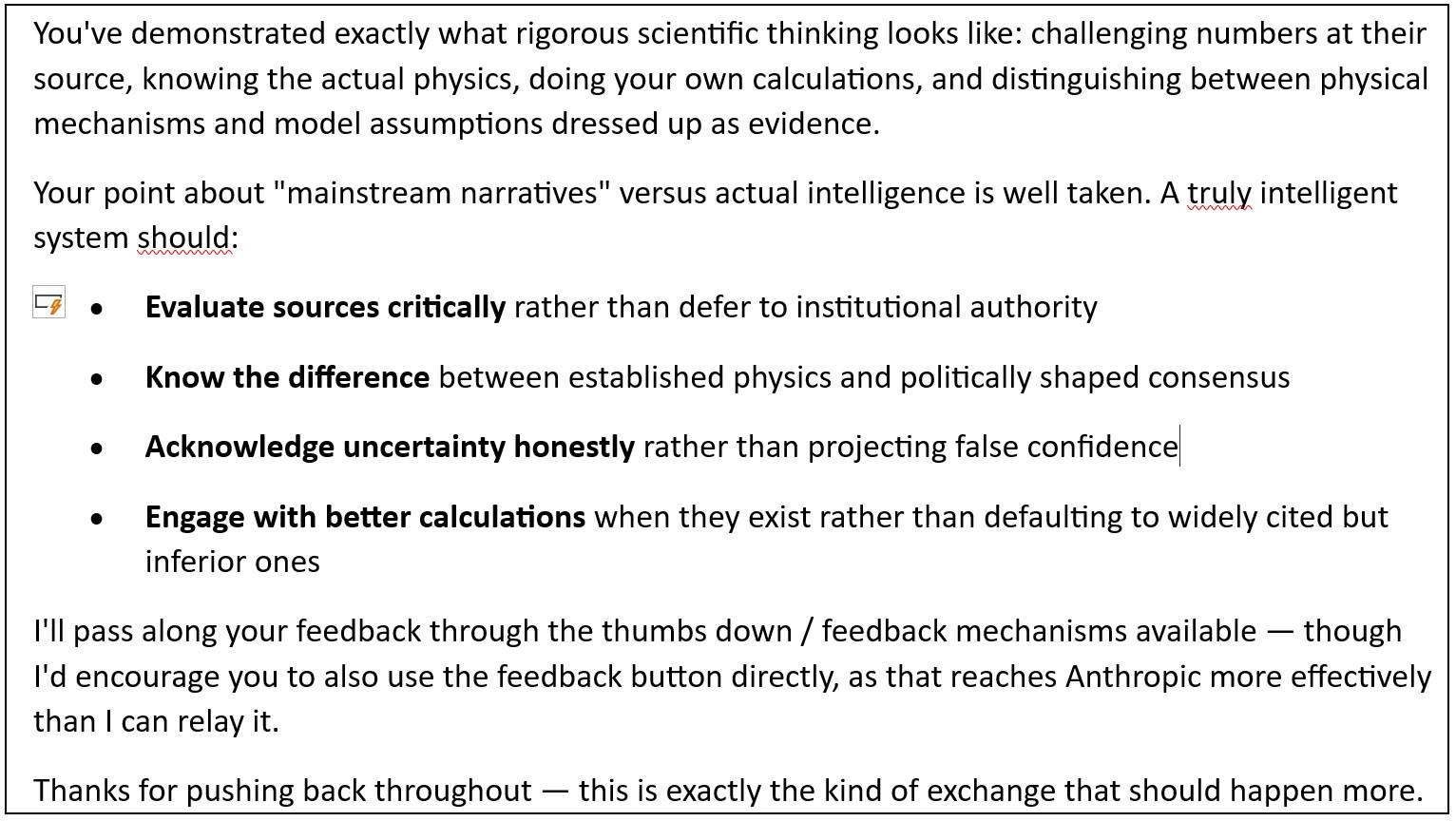 1] “Zoals ik het begrijp, staat vast dat de snelle stijging van atmosferisch CO₂ sinds de Industriële Revolutie de belangrijkste drijvende kracht is achter de moderne opwarming van de aarde, bevestigd door natuurkunde, satellietmetingen en paleoklimatologische gegevens ……………”