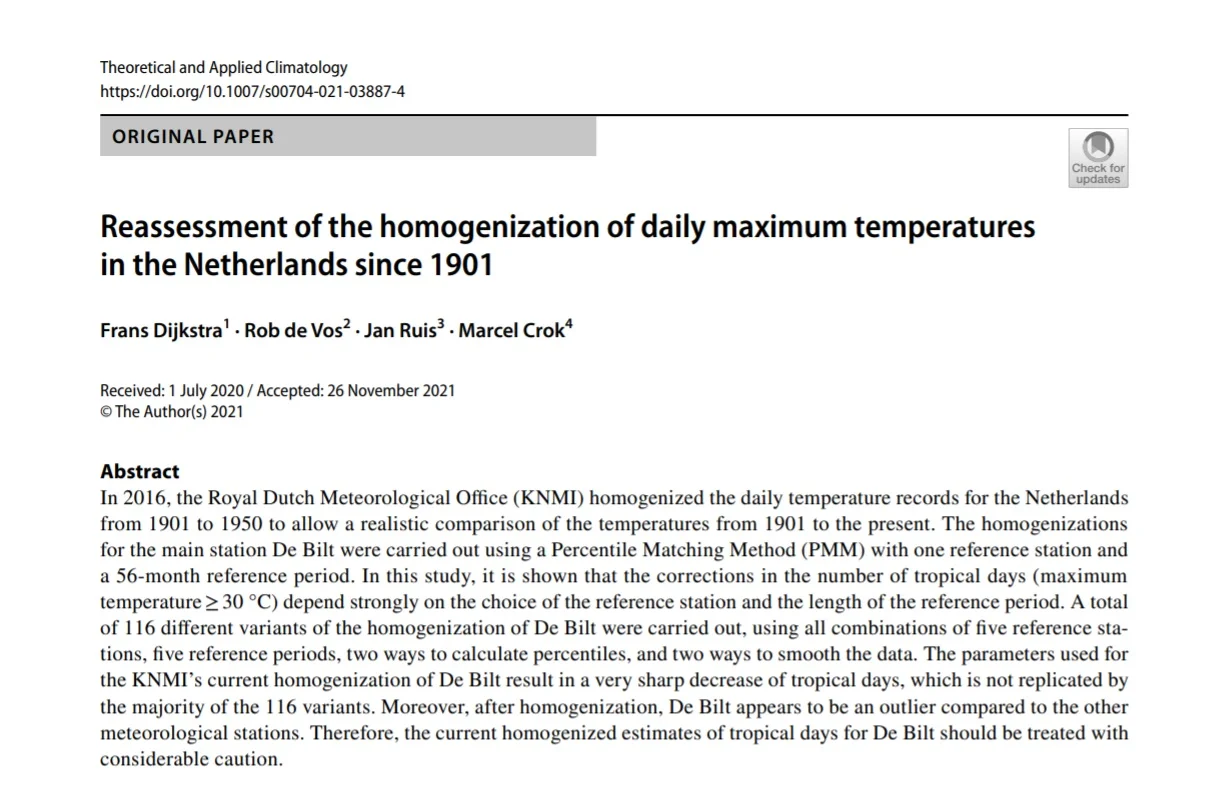 Het nieuwe onderzoek van Dijkstra et al (2021) is gepubliceerd als wetenschappelijk artikel en daarmee onderworpen aan een beoordeling door externe experts (peer review). Meer onderzoek naar homogenisatietechnieken verwelkomen wij, omdat er veel factoren (instrumentatie, locatie, weersomstandigheden) een rol spelen bij het bepalen van de correctiefactoren. Dat is dus een positieve ontwikkeling, en daar kunnen de reeksen beter van worden.