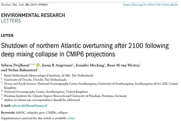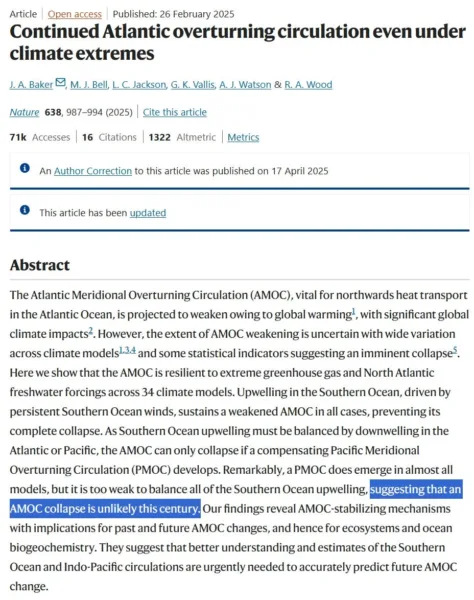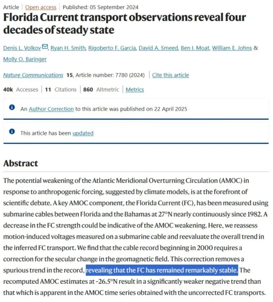 Het artikel baseert zich sterk op computermodel-prognoses (CMIP6) en schetst een somber beeld van het instorten van de menging van warm en koud water in de diepe oceaan, wat zou leiden tot extreme afkoeling in Europa en wereldwijde verstoringen. Maar dit is het probleem: het citeert een belangrijk artikel uit 2024 over de Florida Current (een belangrijk onderdeel van de AMOC) dat juist langdurige stabiliteit aantoont verkeerd, en het laat twee baanbrekende artikelen die dit jaar in het tijdschrift Nature zijn gepubliceerd en die het idee van een dreigende ineenstorting van de AMOC rechtstreeks tegenspreken, volledig buiten beschouwing.
