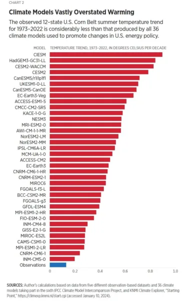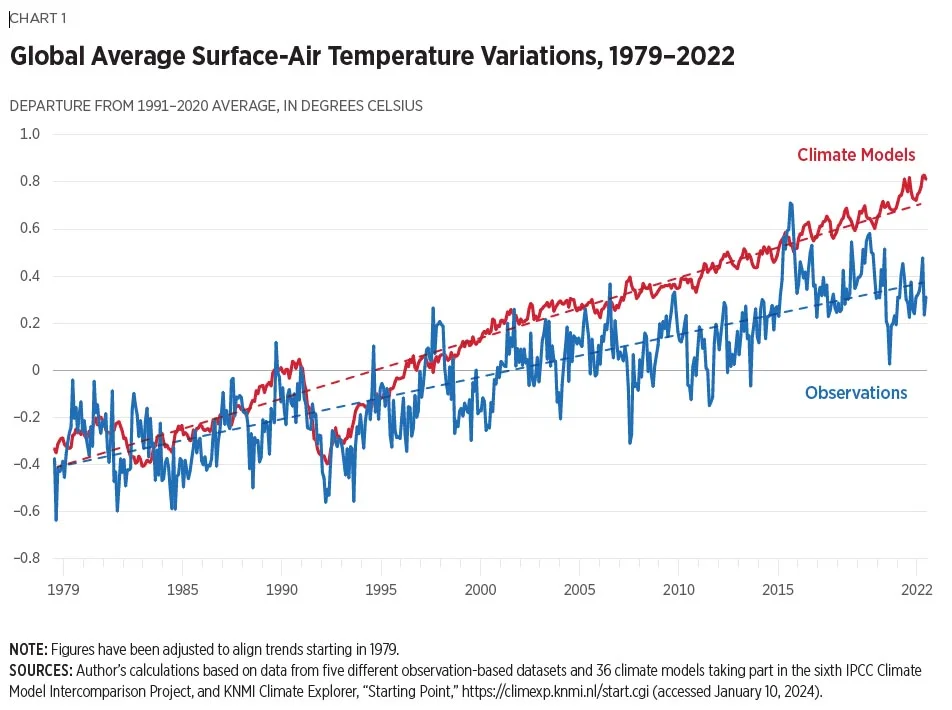 Klimaatmodellen produceren te veel opwarming in vergelijking met waarnemingen van de afgelopen vijftig jaar, de periode waarin de opwarming en de toename van CO2 in de atmosfeer het snelst verliepen. De discrepantie varieert van meer dan 40 procent voor de mondiale oppervlaktetemperatuur van de lucht, ongeveer 50 procent voor de mondiale lagere atmosfeertemperaturen en zelfs een factor twee tot drie voor de Verenigde Staten in de zomer. Deze discrepantie wordt nooit genoemd wanneer diezelfde modellen worden gebruikt als basis voor beleidsbeslissingen.
