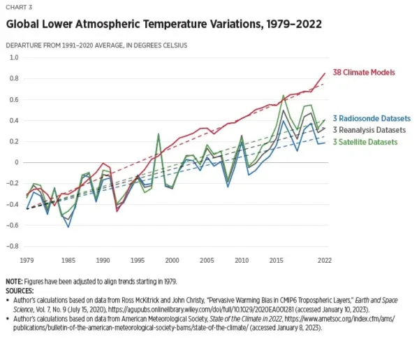 In deze grafiek wordt het gemiddelde van vijf verschillende op waarnemingen gebaseerde datasets (blauw) vergeleken met het gemiddelde van 36 klimaatmodellen die deelnemen aan het zesde IPCC Climate Model Intercomparison Project (CMIP6). De modellen komen gemiddeld tot een 43 procent snellere opwarming dan is waargenomen van 1979 tot 2022. Dat is de periode met de snelste stijging van de mondiale temperatuur en de antropogene uitstoot van broeikasgassen en komt ook overeen met de periode waarvoor satellietwaarnemingen beschikbaar zijn (zie hieronder). Deze discrepantie tussen modellen en waarnemingen wordt zelden genoemd, ondanks het feit dat het (ruwweg) het gemiddelde van de modellen (of zelfs de meest extreme modellen) is dat wordt gebruikt om beleidsveranderingen in de VS en daarbuiten te promoten.