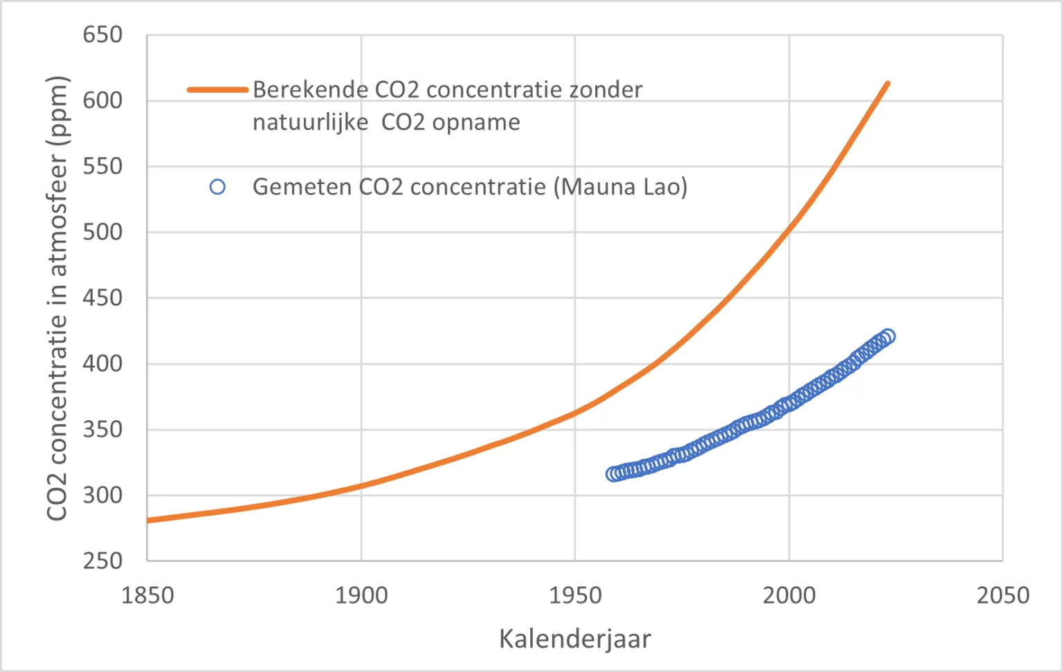 De blauwe open cirkeltjes geven de jaarlijkse gemeten concentraties weer sinds 1959, het jaar waarin systematische CO2-metingen zijn begonnen in het Mauna Loa Observatory op Hawaii. In 1959 bedroeg de concentratie 316 ppm en in 2023 was die opgelopen tot 421 ppm. De gemeten concentraties liggen beduidend onder de berekende oranje kromme en dat verschil is geheel toe te schrijven aan de natuurlijke opname van CO2. Van de totale uitstoot vanaf 1850 is er op dit moment bijna 60 procent opgenomen door de biosfeer en de oceanen.