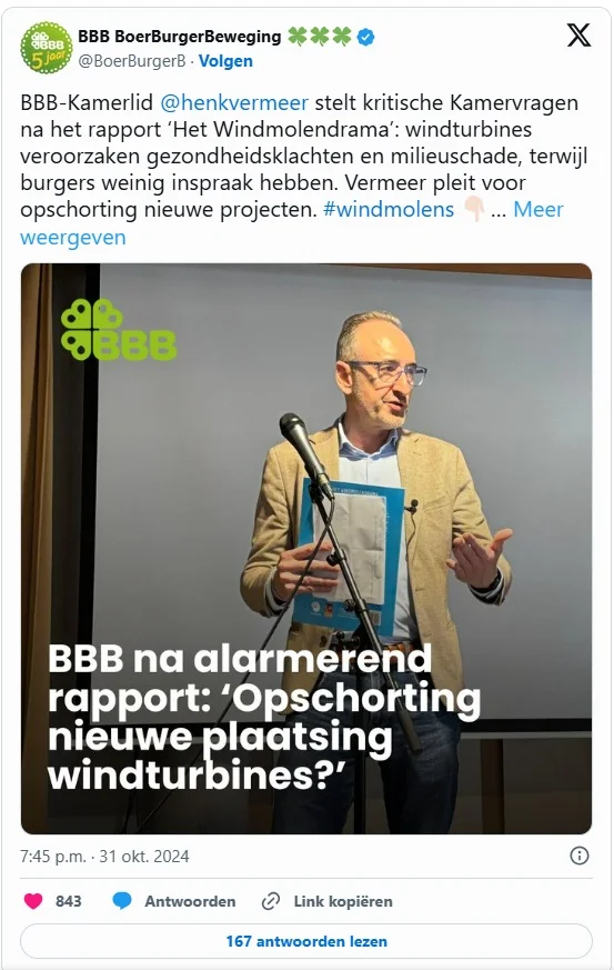 Heel verdrietig zien we nu dat de geschiedenis zich herhaalt rond een andere majeure lawaaibron. Het zijn nu niet vliegtuigen, maar windturbines die omwonenden het leven zuur maken. We zien dat de politiek helemaal niets heeft geleerd van het bestuurlijke geknoei rondom Schiphol en weer precies dezelfde fouten maakt. Omdat het plan is om ons hele land vol te zetten met windturbines, gaat het nu niet meer alleen om omwonenden van luchthavens, maar om bewoners van vrijwel het gehele land.