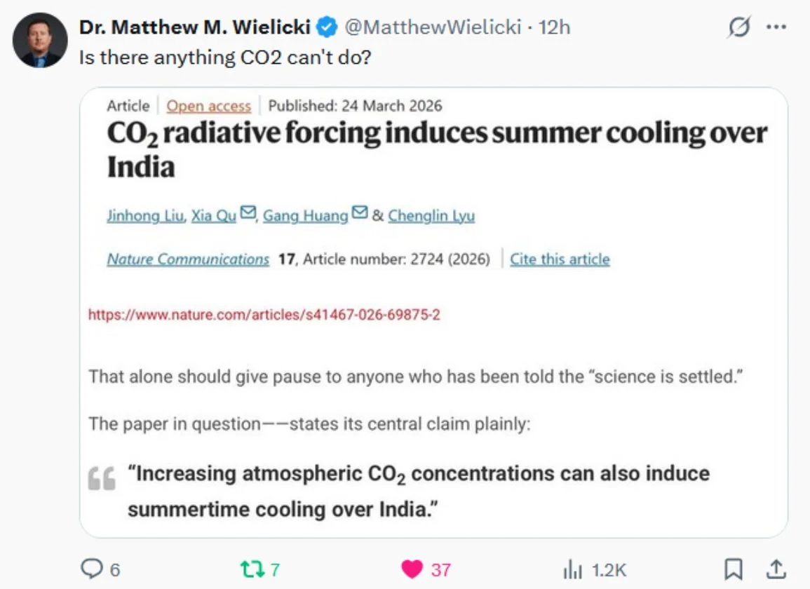 Zoals dr. Matthew Wielicki het droogjes verwoordde: “Is er iets wat CO₂ niet kan?” De studie achter deze opmerking stelt dat stijgende CO2-niveaus onder bepaalde omstandigheden zelfs tot regionale afkoeling kunnen leiden – wat onderstreept hoe flexibel – en onzeker – de resultaten van klimaatmodellen kunnen zijn.