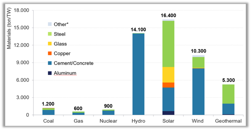 Deze toevoegingen vergen enorme hoeveelheden primaire energie door de mijnbouw en de productie; vaak niet meegenomen in standaardstatistieken. Zo vereist het opwekken van één TWh levenslange elektriciteit uit zonne-energie 340-560 kiloton staal plus koper en zeldzame aardmetalen, vergeleken met slechts één tot twee kiloton staal voor steenkool of gas. Windenergie doet het niet veel beter en vergt 30-50 kiloton staal en drie tot zes kiloton koper per TWh. De winning van deze materialen is energie-intensief, wordt voornamelijk verricht met vrachtwagens en mijnbouwapparatuur, die worden aangedreven door fossiele brandstoffen. Daarmee worden verborgen primaire energiekosten ingebouwd die de IEA met haar ‘gedeeltelijke substitutiemethode’ gemakshalve achterwege laat door uit te gaan van bijna 100% efficiëntie voor hernieuwbare energie.