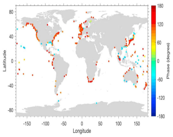 Het kaartje van figuur 3 toont de fase waarin zich de nodale cyclus bevindt op de 574 getijdestations die Peng et al analyseerden. Te zien is dat het overgrote deel (rood) van de stations zich in dezelfde nodale fase bevindt, en op ruim 40 stations bevindt de nodale cyclus zich in tegenfase.