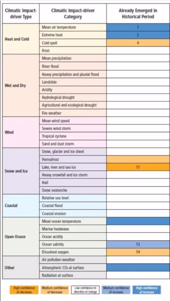 Hier onder de IPCC-tabel die laat zien of extreme weersomstandigheden wel of niet toenemen: