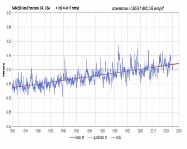Figuur 1 toont de tijdreeks per maand van het getijdenstation San Francisco sinds 1900. Rood is de lineaire trendlijn, oranje de kwadratische trendlijn. Die laatste is nauwelijks te zien omdat hij nagenoeg samenvalt met de lineaire trendlijn. Oorzaak is de minimale versnelling (rechtsboven te zien in de figuur). Voor de drie andere stations, Galverston Pier, Grand Isle en The Battery gelden eveneens verwaarloosbaar lage kwadratische trends van respectievelijk 0,01540 mm/jaar, 0,00901 mm/jaar en 0,01412 mm/jaar.