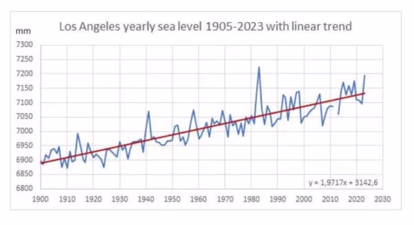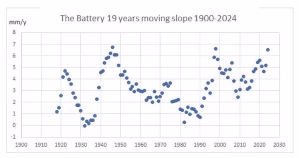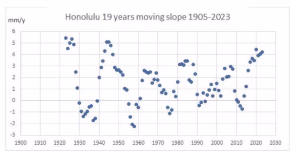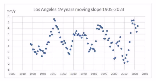 Ik nam de proef op de som en berekende de trend over de data van de laatste 19 jaren (2005-2023) van station Los Angeles volgens de methode van Slangen. Die trend is 4,4 mm/jaar (a in de formule y=ax+b). Opvallend hoog, als je bedenkt dat de trend over de gehele periode slechts 1,96 mm/jaar is (figuur 1 linksboven). Om er achter te komen of er werkelijk sprake is van een versnelling in het laatste stukje van de reeks berekende ik daarna voor alle periodes van 19 jaar lang de trend, dus voor 1900-1918, 1901-1919 enz. tot en met de laatste periode van 2005-2023. En zette de uitkomsten in een grafiek: