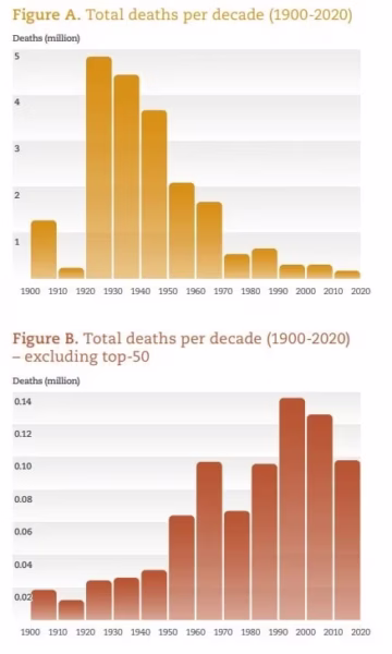 Door de 50 grootste rampen uit te sluiten is de dalende trend uit de Lomborg-grafiek plots veranderd in een stijgende sterftetrend. Maar waarom zou je de 50 grootste rampen uitsluiten van je grafiek? Het goede nieuws is toch juist dat zulke grote rampen tegenwoordig niet meer voorkomen? Lomborg reageerde in een draadje op X op de afbeeldingen van EM-DAT met de volgende aanvulling: