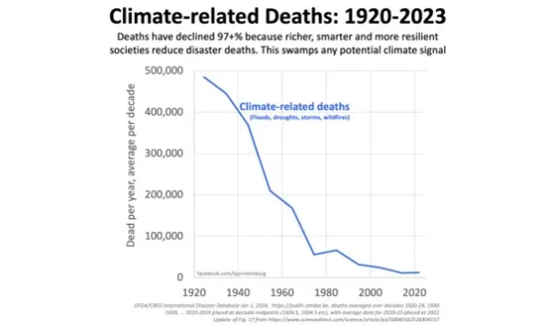 De grafiek laat in één oogopslag zien waarom onze obsessie met klimaat totaal misplaatst is. De verklaring voor de trend is simpel: toegenomen welvaart. De mensheid is spectaculair welvarender geworden in de afgelopen eeuw. Welvaart bracht technologische vooruitgang. De meeste weersextremen zien we nu dagen tot weken van tevoren aankomen zodat er maatregelen genomen kunnen worden. Huizen en gebouwen zijn in rijkere landen veel beter bestand tegen orkanen en soms zelfs tegen aardbevingen (Japan).