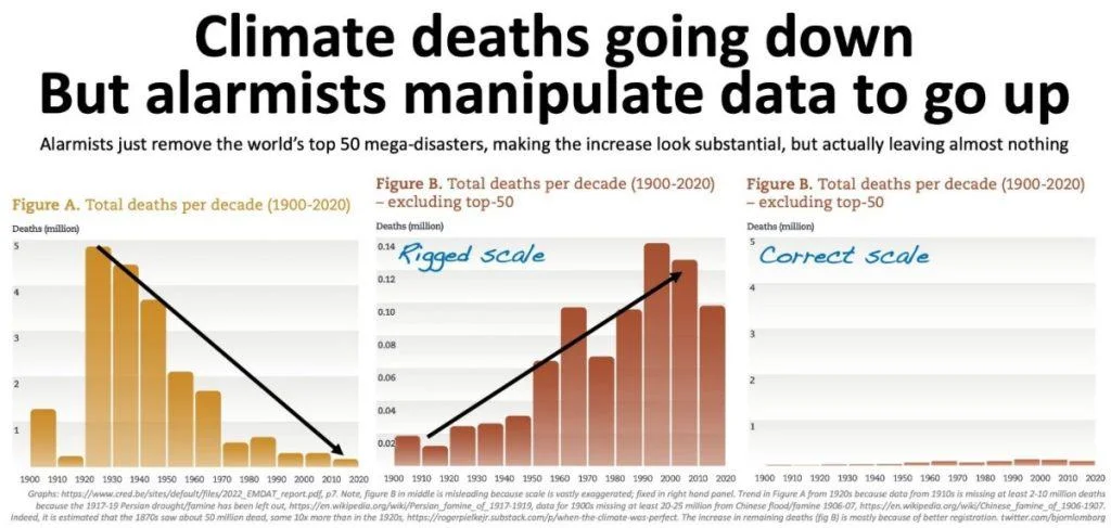 Door de 50 grootste rampen uit te sluiten is de dalende trend uit de Lomborg-grafiek plots veranderd in een stijgende sterftetrend. Maar waarom zou je de 50 grootste rampen uitsluiten van je grafiek? Het goede nieuws is toch juist dat zulke grote rampen tegenwoordig niet meer voorkomen? Lomborg reageerde in een draadje op X op de afbeeldingen van EM-DAT met de volgende aanvulling: