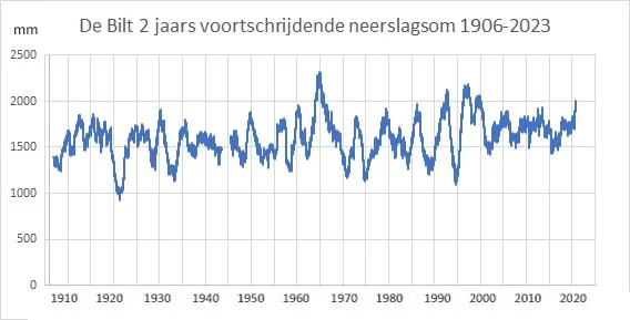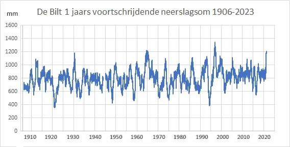 In een van de laatste artikelen op de website schreef ik over de jaarlijkse neerslagsom in De Bilt vanaf 1906 t/m 2023. Op verzoek van een geleerde kennis gebruikte ik niet de kalenderjaren maar de 1-jaarlijkse voortschrijdende neerslagsom, dus de neerslagsom van 1 jan1906 t/m 31 december 1906, het volgende stapje van 2 januari 1906 t/m 1 januari 1907, enzovoorts. Met ruim 43.099 daggegevens zijn dat 42.917 stapjes van 365 dagen. Figuur 2 toont het resultaat. Alleen in de nadagen van de Tweede Wereldoorlog in 1945 ontbreken 30 daggegevens.
