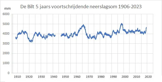 Mijn geleerde kennis vroeg me om ook neerslaggrafieken te maken met een voortschrijdende neerslagsom over 2 jaar, 5 jaar en 10 jaar. Dan kon je zien dat die neerslagsom echte persistentie vertoont, dus in herhaling valt.