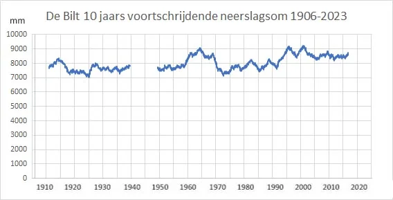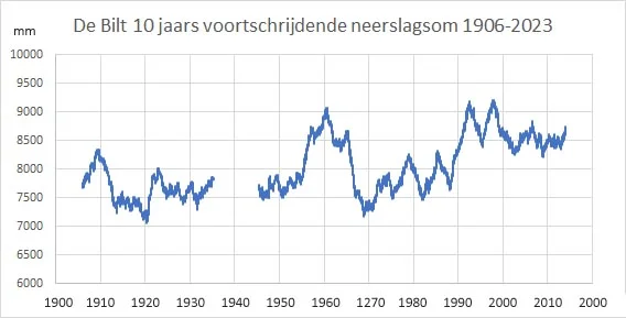 Te zien is dat er zelfs als je over een periode van 10 jaren de voortschrijdende neerslagsommen berekent er sprake is van lange periode waarin de neerslagsom meer stijgt dan daalt en vice versa.