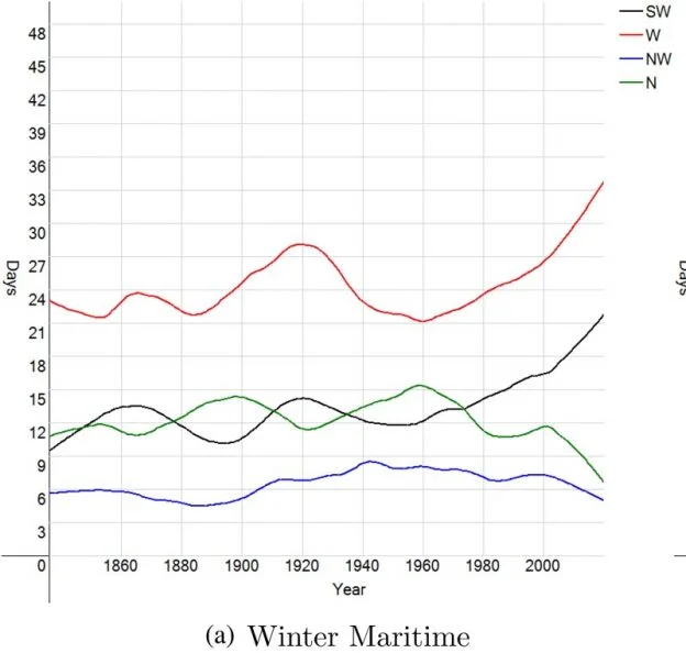 De grafiek van figuur 6 is afkomstig van de publicatie van Hoogeveen et al in 2022. Ik heb daar al vaker over geschreven. De grafiek laat voor het winterseizoen zien wat het brongebied was van maritieme lucht (in dagen per jaar). Vooral de laatste decennia schieten W en SW omhoog en dalen NW en N. W en SW stijgen sterker dan NW en N, wat wijst op toename van maritieme lucht ten kosten van continentale lucht. Bovendien zijn W en SW afkomstig van een warmer deel van de Atlantische Oceaan, dus hogere temperaturen en vaak meer neerslag.