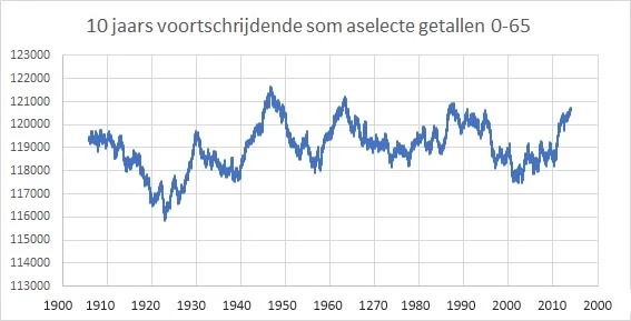 Ik heb in Excel de 43.099 neerslag dagwaarden van 1 januari 1906 t/m 31 december 2023 vervangen door 43099 aselecte getallen tussen 0 en 65. Daarvan heb ik de 10-jaars voortschrijdende som berekend en in de grafiek van figuur 8 gezet. De persistentie in het signaal is net zo duidelijk als in het echte neerslagsignaal van figuur 7. Dat wijst er op dat persistentie in het neerslagsignaal ook door toeval bepaald wordt. Ik schreef dat mijn geleerde kennis en die reageerde: “Ja, dat zal statistici niet verbazen: accumulatie van puur willekeurig (witte) ruis levert persistentie (“Brownian motion”).”