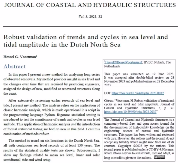 De zeespiegel langs de Nederlandse kust versnelt niet. Dat is de voornaamste conclusie van de paper Robust validation of trends and cycles in sea level and tidal amplitude in the Dutch North Sea, dat onlangs gepubliceerd is in de Journal of Coastal and Hydraulic Structures. De paper toont tevens aan dat scenario’s voor de stijgsnelheid van de zeespiegel, zoals die gepresenteerd worden door het IPCC en het KNMI, in het jaar 2020 al twee keer hoger liggen dan de gemeten snelheid.