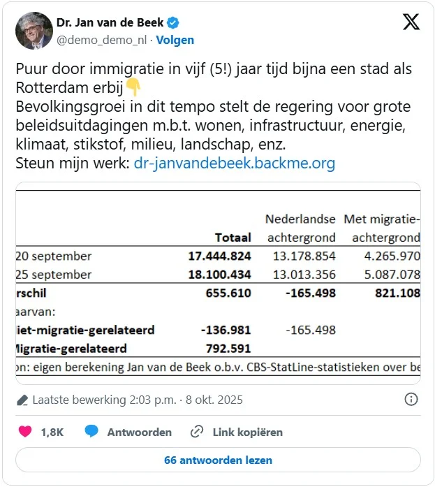 Laat ik één voorbeeld eruit lichten, de huidige asielchaos, om te laten zien hoe zo’n concrete oplossing eruitziet. Asielbeleid hoort onderdeel te zijn van een breder immigratiebeleid en een breder immigratiebeleid hoort onderdeel te zijn van een nog breder beleid voor bevolkingsgroei, waarbij bevolkingsgroei wordt bepaald door de natuurlijke aanwas (geboorte minus sterfte) + het migratiesaldo (immigratie minus emigratie). Zo was in 2023 de natuurlijke aanwas -6.000 en het migratiesaldo +137.000, resulterend in een bevolkingsgroei van +132.000. Let op, het gaat hier over inwoners met de Nederlands nationaliteit. Bij dit getal horen dus niét de asielzoekers die (nog) geen verblijfsvergunning hebben en uiteraard ook niet de grote groep van illegalen. Als we 1990 vergelijken met 2025, dan bedroeg de bevolkingsgroei 3 miljoen zielen.